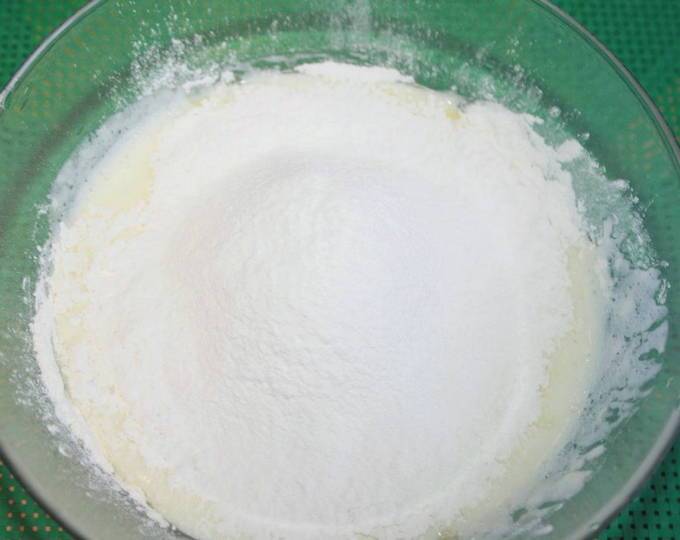Шаг 2. Просеять муку в ту же емкость, добавить разрыхлитель и хорошенько перемешать. Вымесить тесто, оно получается песочным.