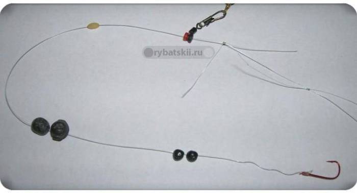 После чего ставим две бусинки – сначала большую, а затем чуть поменьше. Делаем на леске петлю, чтобы надёжно закрепить поводок с крючком