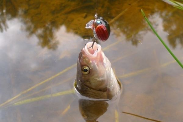 Насадкой служит обыкновенная муха, мелкий кузнечик, можно использовать насекомых, обитающих возле этого конкретного водоема (поденка, другие летающие насекомые).