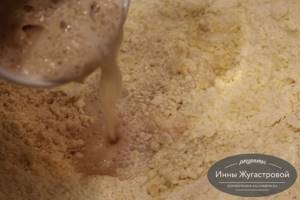 Посолить, перемешать. В полученную масляно-мучную крошку вылить дрожжи. На фото видно, что дрожжи активизировались, поверхность покрылась пенкой.