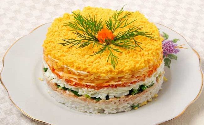 Один из любимых среди россиян салатов, Мимоза, готовят как раз с рыбными консервами. И это блюдо часто украшает стол в праздники: Новый год, 8 марта, Пасха, день рожденья. В состав салата входят самые простые продукты: картошка, морковь, лук, яйца, майонез.