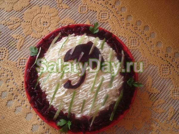 - Лук измельчается, насыпается сверху, поливается майонезом.