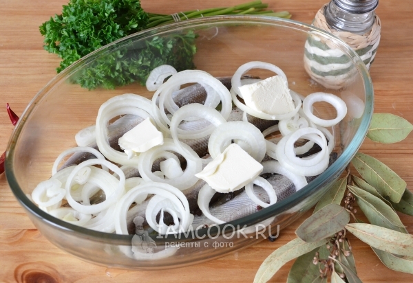 Шаг 6. Емкость, в которой будет запекаться блюдо, промажьте маслом. Распределите овощную подушку. Тушки ряпушки разрежьте пополам и уложите сверху.