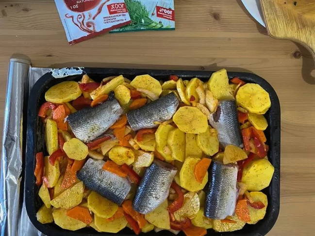 - Рыбу выложить слоями в форму для запекания, посолить, поперчить. Сверху высыпать всю зажарку вместе с растительным маслом.