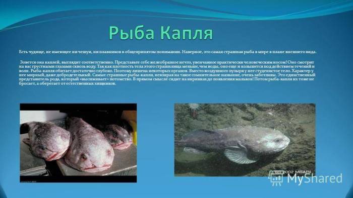 Рыба-капля не похожа ни на одну рыбу, скорее, на инопланетную сущность. Ее тело – сплошная студенистая масса, на которой нет и намека на чешую, плавники. Вес «капли» доходит до 10 кг. Длина – до 80 см. У нее огромные, грустные глаза, и нос, по форме очень похожий на человеческий.