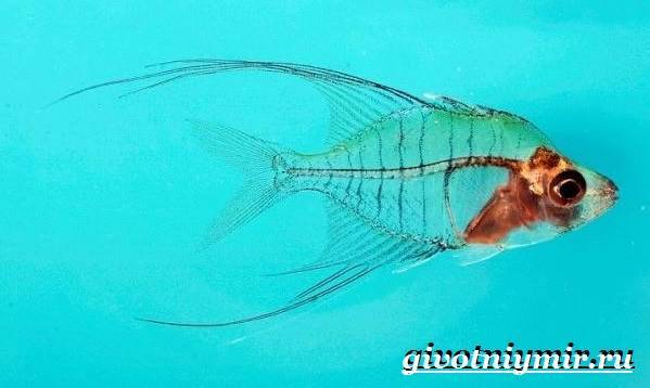 Стайную рыбу стеклянный окунь рекомендуется содержать в количестве не менее 8-10 особей. При всей своей активности это мирный и уживчивый обитатель водоема, достаточно пугливый и нежный.