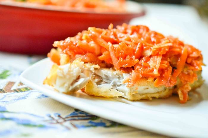 - Получившимся соусом смажьте форму для духовки. Затем переложите в форму кусочки пикши. Обжарьте лук с морковью до мягкости. Когда остынет, распределите на поверхности рыбы.