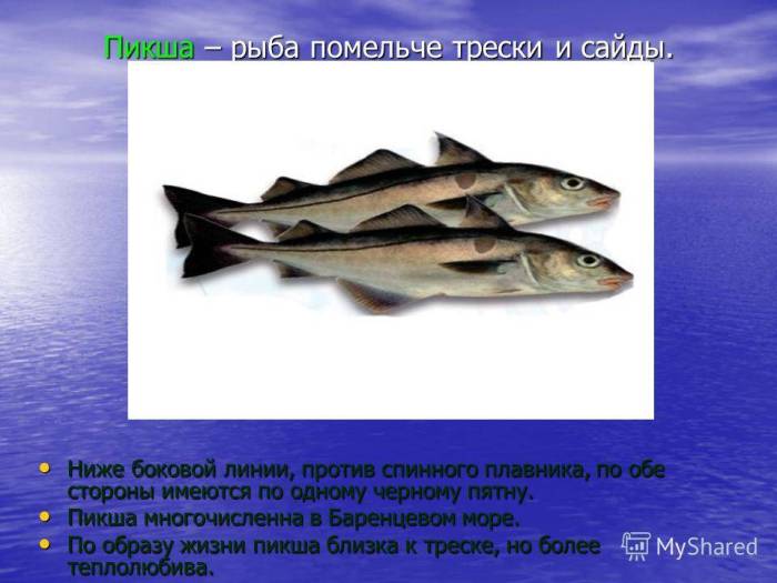 Одним из представителей семейства тресковых рыб является пикша. Это морская стайная рыба, обитает в соленых морях Атлантического и Северного ледовитого океанов, ведет донный образ жизни. Является важным промысловым видом. Итак, что за рыба пикша, где обитает и чем полезна.
