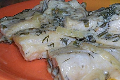 - Сметану смешайте с мукой, небольшим количеством соли и приправ. Залейте ей рыбу.