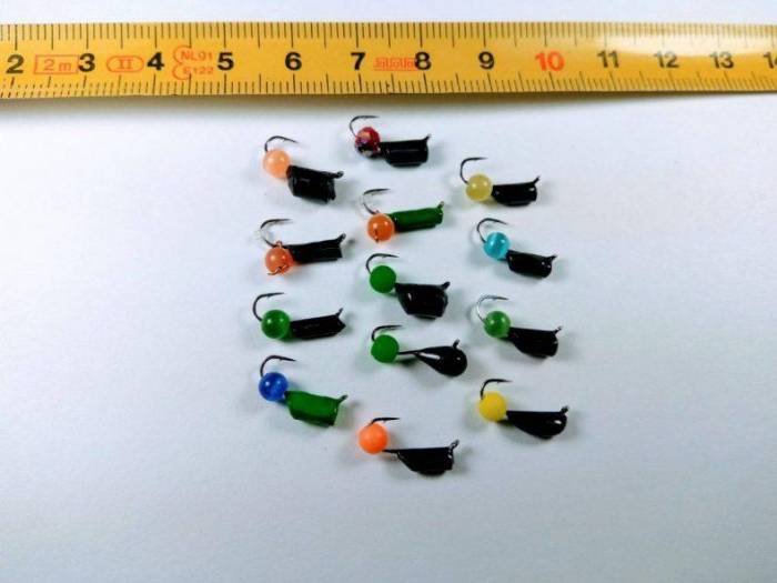 Для такого украшения мормышки нужно использовать разноцветные бисеринки — черные, белые, красные, желтые, зеленые и так далее — в разных сочетаниях, чтобы приманка становилась более контрастной.