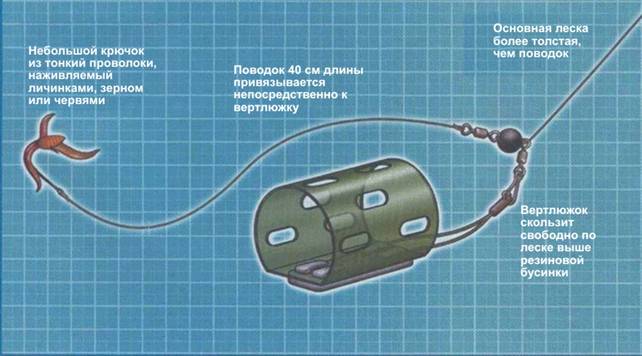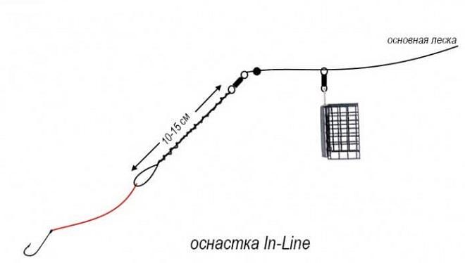Для этой цели чаще применяется удилище длиной 3,6 метра. Фидерная оснастка Инлайн позволяет рассчитывать на большой улов. Для кормушки делают отвод из толстой лески или флюорокарбона. Для присоединения поводка рекомендуется использовать резиновую вставку.