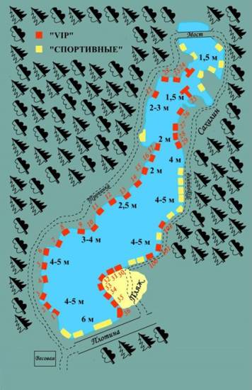 В общем площадь водоема примерно 15 Га, участок зарыбления немного меньше чем 5 Га, глубина в разных местах от 1 метра до 5, имеет песчаное дно, с небольшим количеством ракушечника и водорослей, рельеф очень неоднородный, присутствуют большие перепады, так и ровные участки.