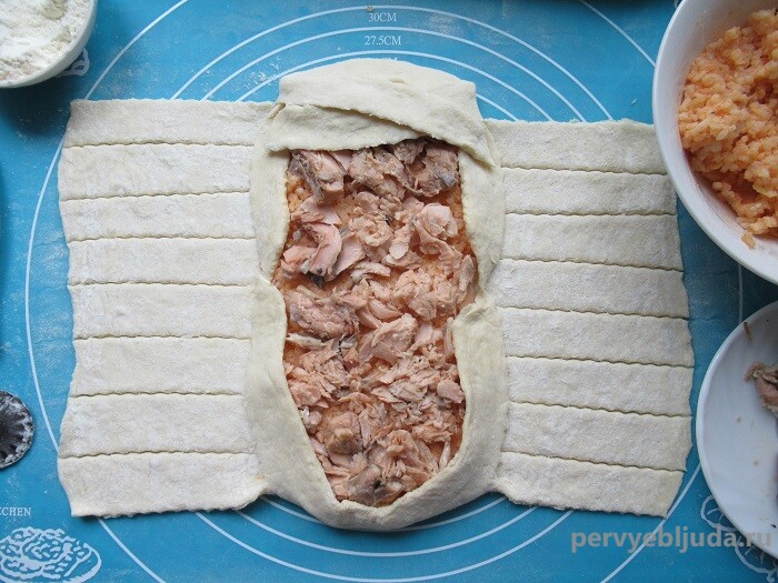 Одну половинку теста пока откладываем в сторону, прикрыв полотенцем. Вторую раскатываем в тонкий пласт до 2 мм. толщиной. Визуально делим его на равные три части. Две боковые из них разрезаем на продольные полосы шириной около 2 см. По центру выкладываем рисовую начинку, а на нее кусочки консервированной рыбы (их слегка разминаем пальцами). Две верхние полосы загибаем по бокам вниз, а две нижние, наоборот, кверху. Таким образом мы «очертили» границы начинки. (ф. 8, 9)