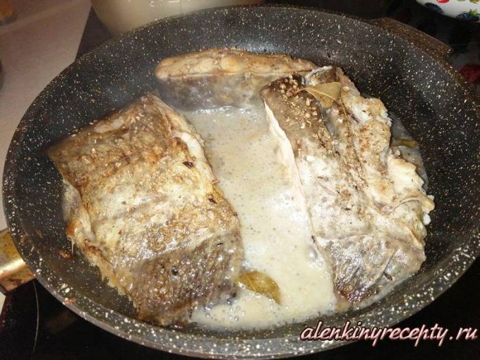 Рыбу нарезаем небольшими кусками, выкладываем на сковороду, посыпаем оставшейся солью, специями и обжариваем на сковороде на среднем нагреве примерно 10 минут с одной стороны. Затем переворачиваем на другую сторону, добавляем лавровый лист, убавляем нагрев до минимума и, накрыв крышкой, продолжаем жарить еще 10 минут. Остужаем прямо в сковороде.