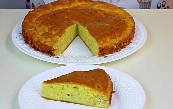 После 20 мину расстойки смазываем верх нашего изделия желтком, растертым с молоком, делаем несколько проколов, и отправляем пирог на выпекание при 180 градусов приблизительно на один час.