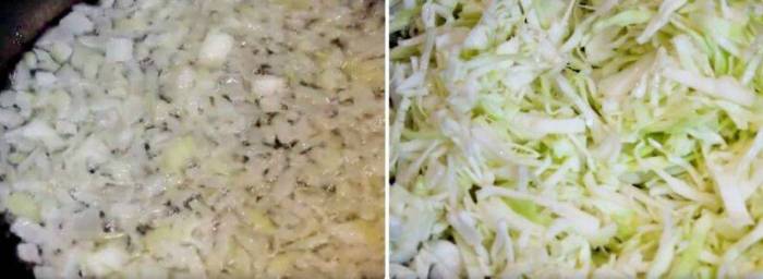 - Приготовьте начинку: нашинкованную капусту, морковь и порезанный полукольцами лук обжарьте в небольшом количестве масла. Добавьте специи, тушите до готовности.