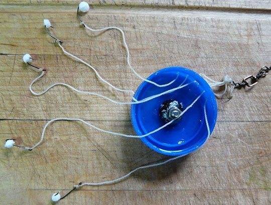 - Взять пластмассовую крышку от бутылки 5-6 см в диаметре. В такие образцы помещается больше приманки и крючков.