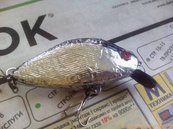 Воблер, изготовленный вторым способом, имеет более привлекательный вид, хотя сам процесс более трудоемок. Кроме того, мастер имеет возможность использовать лопасть разного размера и выбирать угол ее расположения по отношению к оси приманки, добиваясь требуемого заглубления приманки.