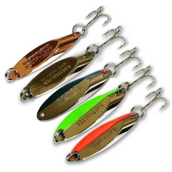 На падении Kastmaster начинает колебаться, и именно в этот момент рыба хватает блесну. Оптимальный размер кастмастера — 5-6 см, а вес — 10-21 г, причём чем крупнее акватория, тем больше по весу должна быть блесна. Для снижения числа зацепов ставят двойники.