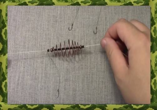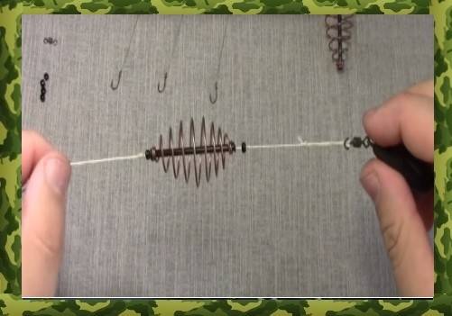 К основной леске или шнуру эта оснастка крепится с помощью вертлюга, через застежку. Потом в кормушки набивается корм и на крючки одевается разнообразная наживка. Так же в качестве наживки на крючки можно одеть пенопласт и крючок будет парить над кормушкой, а это непременно заинтересует рыбу.