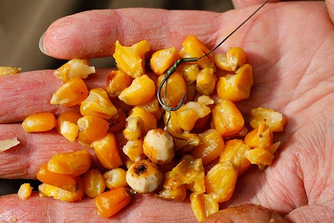 Второй вариант, это насадка кукурузы или гороха на волос, что также эффективно и работает и на реке, и на озере. Даже при многочасовом стоянии в воде сушеная кукуруза остается плотной и сохраняет привлекательность для рыбы. Это естественный корм, который не насторожит даже крупную рыбу, и соблазнит ее на поклевку.