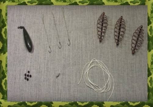 Для изготовления данной оснатки нам понадобится: три кормушки в виде пружинок, три заранее подготовленных поводка с крючком, как правило для данной оснастки поводки делаются не длинные, где-то от 4 до 6 см. также нам понадобится грузик, шесть бусинок, в данном случае я использую обычный бисер, и еще нам нужен будет один вертлюжок.