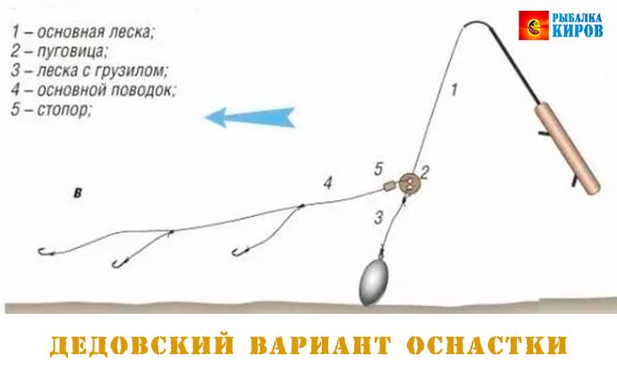 Лучше поставить два поводка длинной 15-20 см, а последний третий закрепить на конце основной лески. Перед последним поводком ставят грузик-дробинку, её можно зажать прямо на леске. Эта дробинка нужна, чтобы прижать оснастку ко дну.