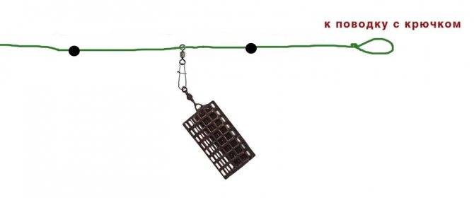 - Кормушку установить на карабин вертлюжка, на свободном конце поводка сделать петлю.