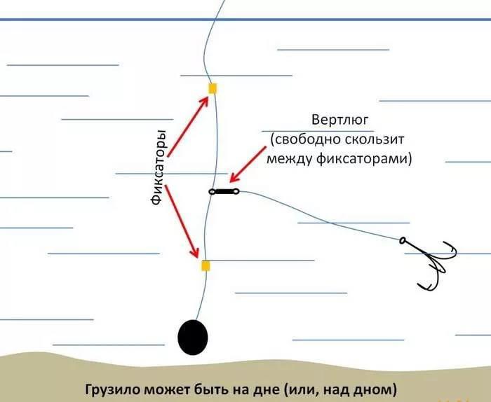 - Изготавливают поводок с крючком, свободный конец его привязывают к вертлюжку.
