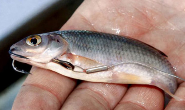 - Если снасть легкая, а крючок одинарный, живца можно насаживать за губу. Если течение сильное, крючок можно продеть через две губы.