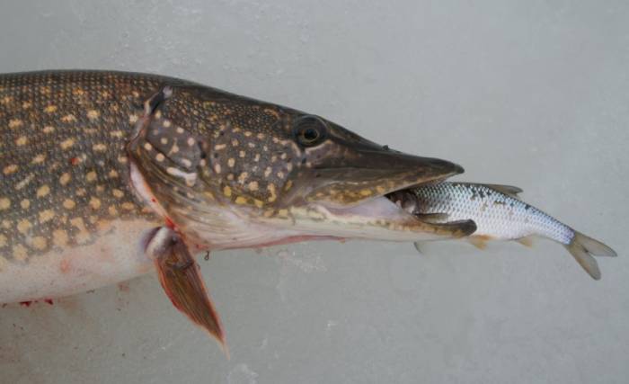 Если погода нестабильная и есть риск замерзания лунков, то стоит выбрать спокойную проводку приманки, чтобы не мешать щуке откушать живца.