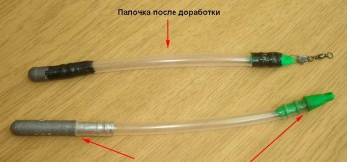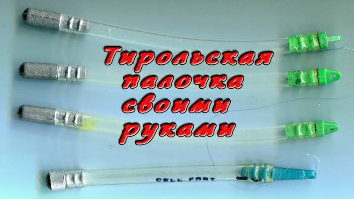 Состоит палочка тирольская из полой пластмассовой трубки, с одного края которой закрепляется грузило, а с другой делается отверстие для лески и поводков. При забросе пластмассовая трубка отгружается на выбранную рыболовом глубину, удерживая приманку на необходимом расстоянии от дна.