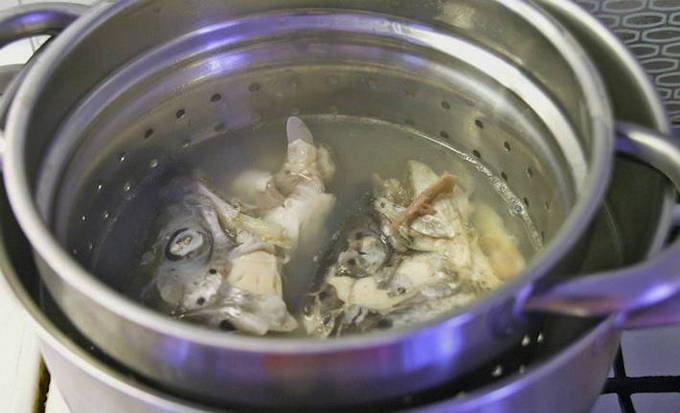 - Готовим части рыбы в подготовленной воде на протяжении 0,5 часа. Затем голову достать, охладить и снять с нее все мясо. Хвост также обобрать.