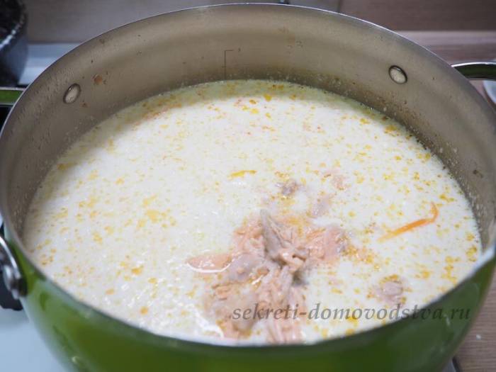 6. Теперь проверим готовность овощей. Они уже сварились, поэтому выливаем в кастрюлю сливочную смесь с мукой и выкладываем кусочки рыбы без косточек.