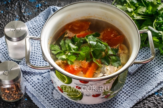 В конце приготовления блюдо солим, заправляем рубленой зеленью, настаиваем 5-10 минут. Таким же образом готовится пикантная уха из скумбрии с помидорами.