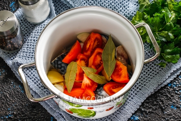 - После этого времени добавить вымытую и нарезанную кусками рыбу, натертые на терке помидоры и черный перец горошком.