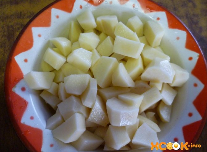 В это время следует очистить картофель, помыть его, обсушить и нарезать некрупными кубиками.