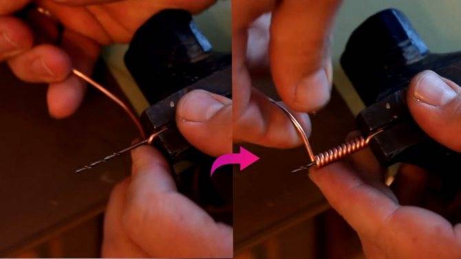 Сначала изготовим сердечник. Ось (у нас это свёрлышко) и проволоку соединяем вместе и зажимаем в тисках. Наматываем проволоку на сверло до желаемого размера заготовки, витками плотно друг к другу.
