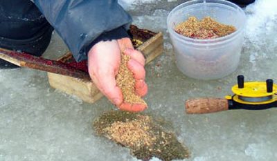 На льду водоема в прикормку добавляют животную составляющую – мотыля или мормыша. Увлажняют прикормку так, чтобы она держалась в кормушке и не вымывалась по пути ко дну, а рассеивалась в течение 5 – 10 минут. Проблема, может возникнуть, когда влажная прикормка начинает замерзать на морозе. Увлажненную прикормку, на водоеме, нужно хранить в тепле.